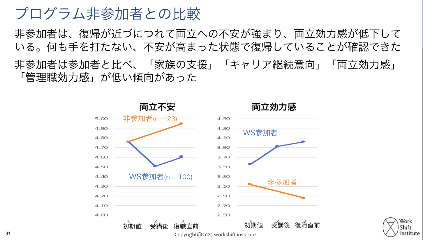 プログラム参加者と非参加者(37名)の比較調査も行っている。非参加者は、復職が近づくにつれて両立への不安が強まり、両立効力感も低下し、不安が高まった状態で復職していることが確認できた。また、「家族の支援」や「キャリア継続意向」、「両立効力感」や「管理職効力感」がそもそも低い傾向にあった。つまり働く意欲や家族のサポートがないと、このような復職支援プログラムに参加しようという気持ちになりにくく、参加しないことでさらに復職後が大変になっていく傾向が確認されている。
