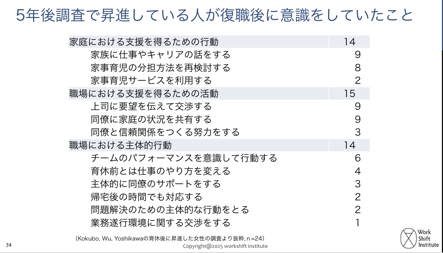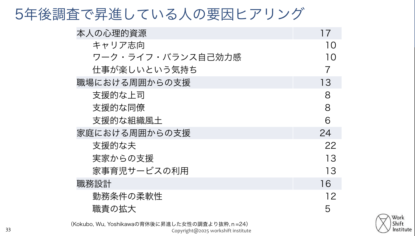 さらに、参加者の5年後も調査した。5年後に約40人にインタビューをした結果、33人が同じ会社で就業を継続しており、このうち24人が昇格・昇進をしていた。この24人に対して、何が効果があったか、何が影響しているかを尋ねたところ、いちばんは「家庭における周囲からの支援」で、特にパートナーの支援が非常に重要であることが明らかになった。ほかは、在宅勤務などの「勤務条件の柔軟性」や、本人の心理的資源であるキャリア志向やワーク・ライフ・バランス自己効力感も効果があった。